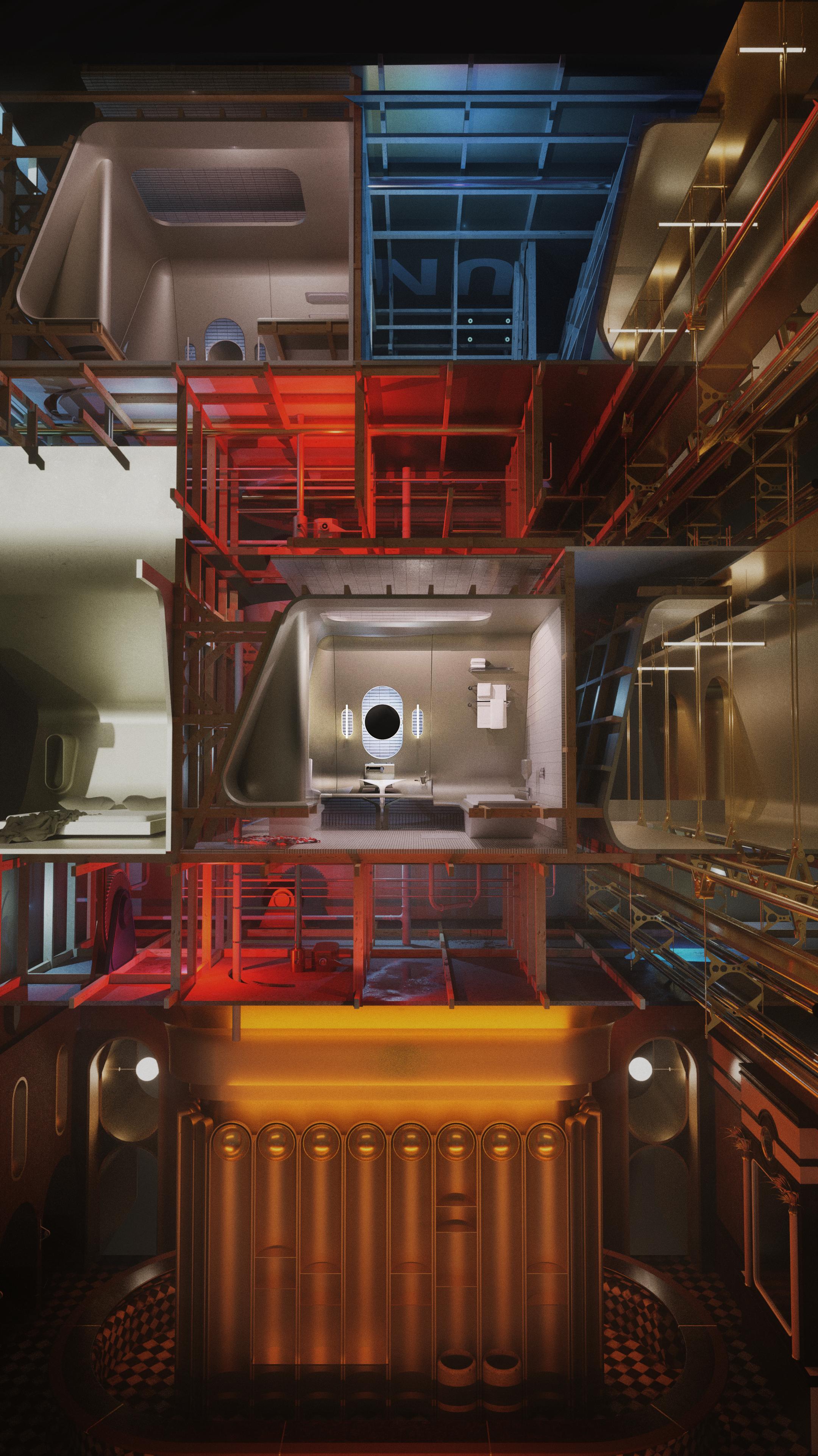 The film (and its corresponding architecture) is broken down to two parts – the front of house and the back of house. Throughout the film space becomes interchangeable with time, where the movement through the different spaces signifies the movement through time.